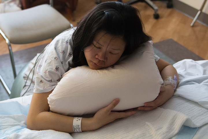 2:30AM: After shower, the contractions slowed down to every 5-6 minute again. So Coach Marcel suggested that I conserve energy by trying to sleep. Of course I couldn't sleep. I hopped back on the gym ball.